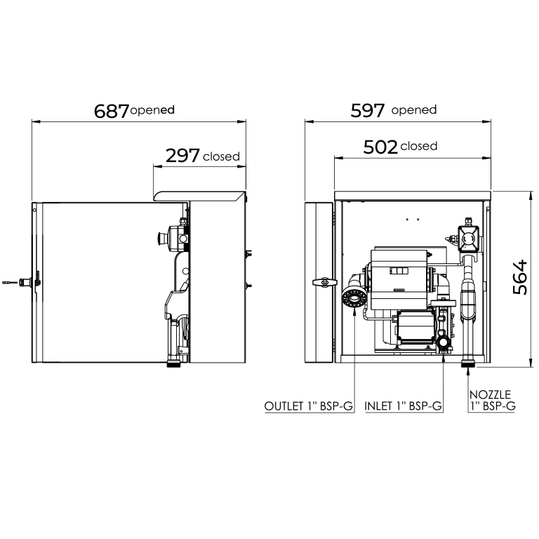Boyalı, anti-korozyon ve hava koşullarına dayanıklı çelikten yapılmış, kilitli bir dolap, pompa ünitesine yetkisiz kullanıcılar tarafından erişilmesini önler. Acil durdurma butonu, hem acil durumlarda bir emniyet anahtarıdır, hem de kabin kapağı kapalıyken pompanın çalışmasını önler. Pompa, titreşim önleyici montaj parçaları ile sabitlenmiştir. Farklı özelliklere sahip çeşitli modellerde mevcuttur.